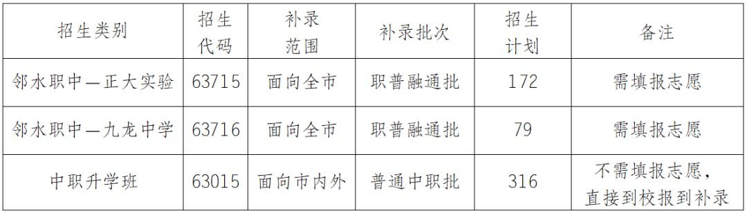 报读中职升学班的考生,不需在网上填报志愿,直接到学校报到补录。幼儿保育,机械加工技术,工业机器人技术应用,汽车运用与维修,新能源汽车运用与维修,计算机应用,会计事务,航空服务,服装制作与生产管理,建筑工程施工,电子技术应用,运动训练(体育特长生),旅游服务与管理,中餐烹饪,美发与形象设计,工艺美术(美术特长生),智慧健康养老服务,园艺技术等18个专业均有少量学位。