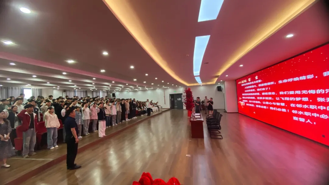 在学生代表的带领下,全体高三学子昂首挺胸,高举右手,庄严宣誓:“人生需要奋斗,我激情满怀;生命呼唤精彩,我无怨无悔。2025年高考,我们来了!我们要用顽强的拼搏,磨练意志,我们要用无悔的汗水,点亮青春;我们要让父母的微笑,在家乡绽放;让飞翔的梦想,张开绚丽的翅膀;让未来的歌声,在六月唱响;让雄心与智慧,在邻水职中闪光。我们相信:高考必胜!我们必胜!邻水职中必创辉煌!”铿锵有力的誓言,响彻整个会场,彰显了同学们决胜高考的坚定决心和豪迈气概。