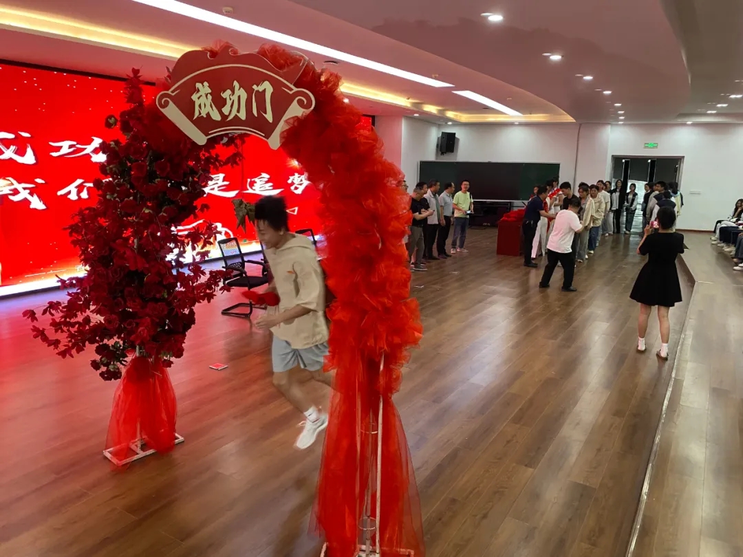 现场响起了激昂的音乐,激动人心的时刻来临了,学校精心布置了“成功门”,门中悬挂着一串香甜的粽子。恰逢端午时节,学校为每一位学子送上了暖心的礼品 。粽子寓意着“高中”,而可乐罐上刻着的“金榜题名”“高考必胜”等祝福语,让学生们倍感温暖。同学们接过领导亲手送上礼品,满怀信心,大步跨越着去碰“成功门”上的粽子,两侧的老师与现场的同学们用热烈的掌声为他们加油打气!